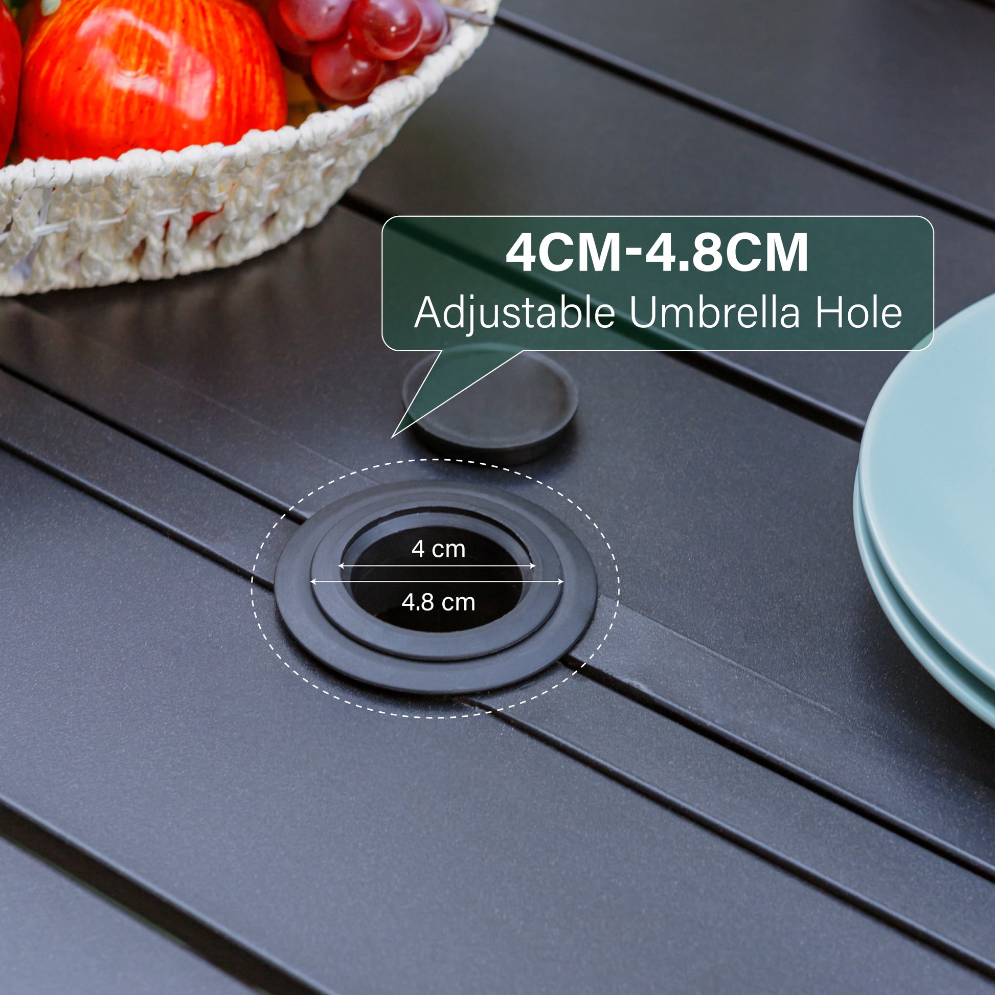- Adjustable Umbrella Hole: This garden dining table with parasol hole design with 4 CM - 4.8CM diameter which helps fix most umbrellas in position on the tabletop, so you can add umbrella to protect your food and guests from the bright sun.