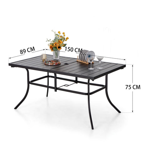 - Rectangle Dining Table: 75H x 150 L x 89W CM. This patio table is designed for 6 seats, roomy enough for outdoor dinners with families and friends.